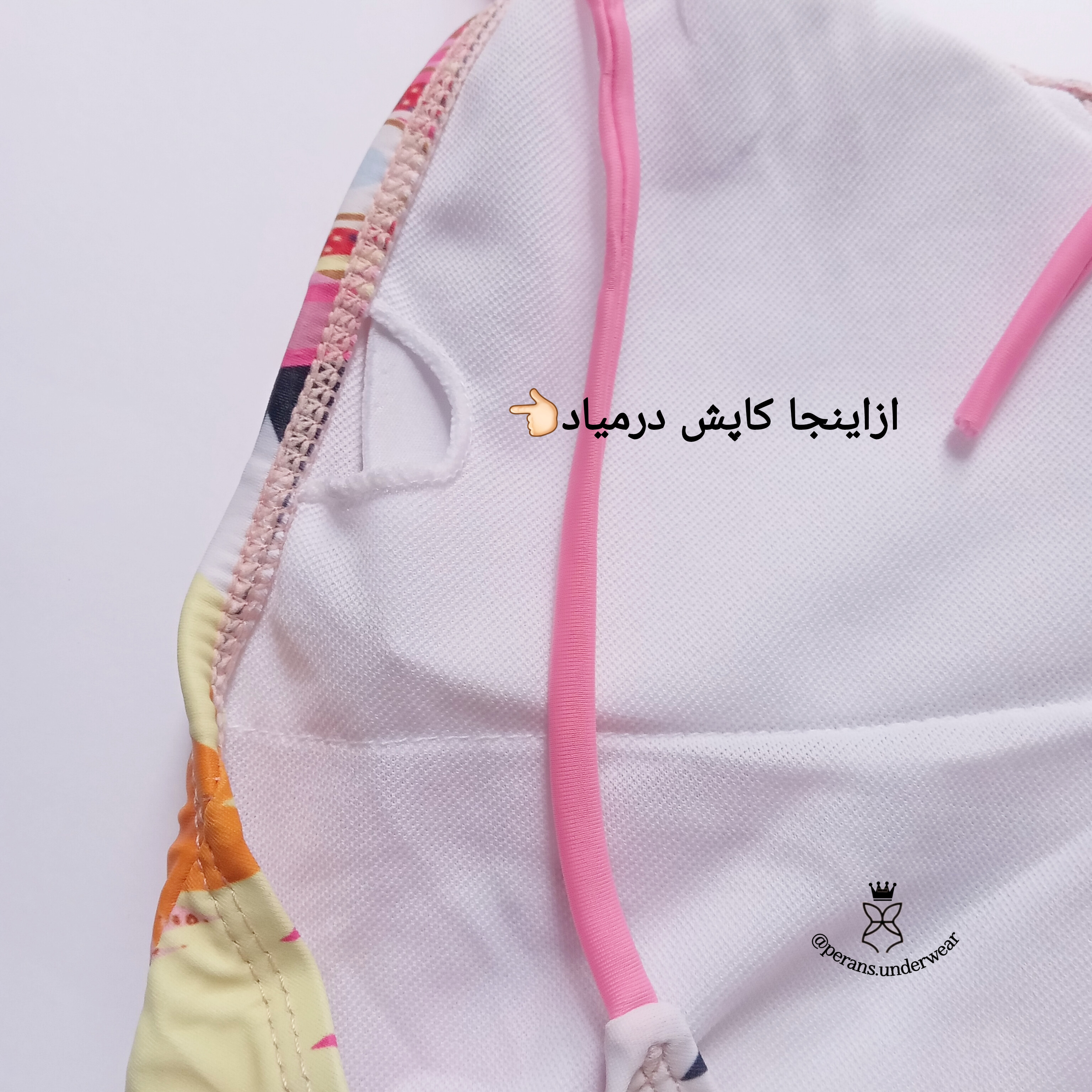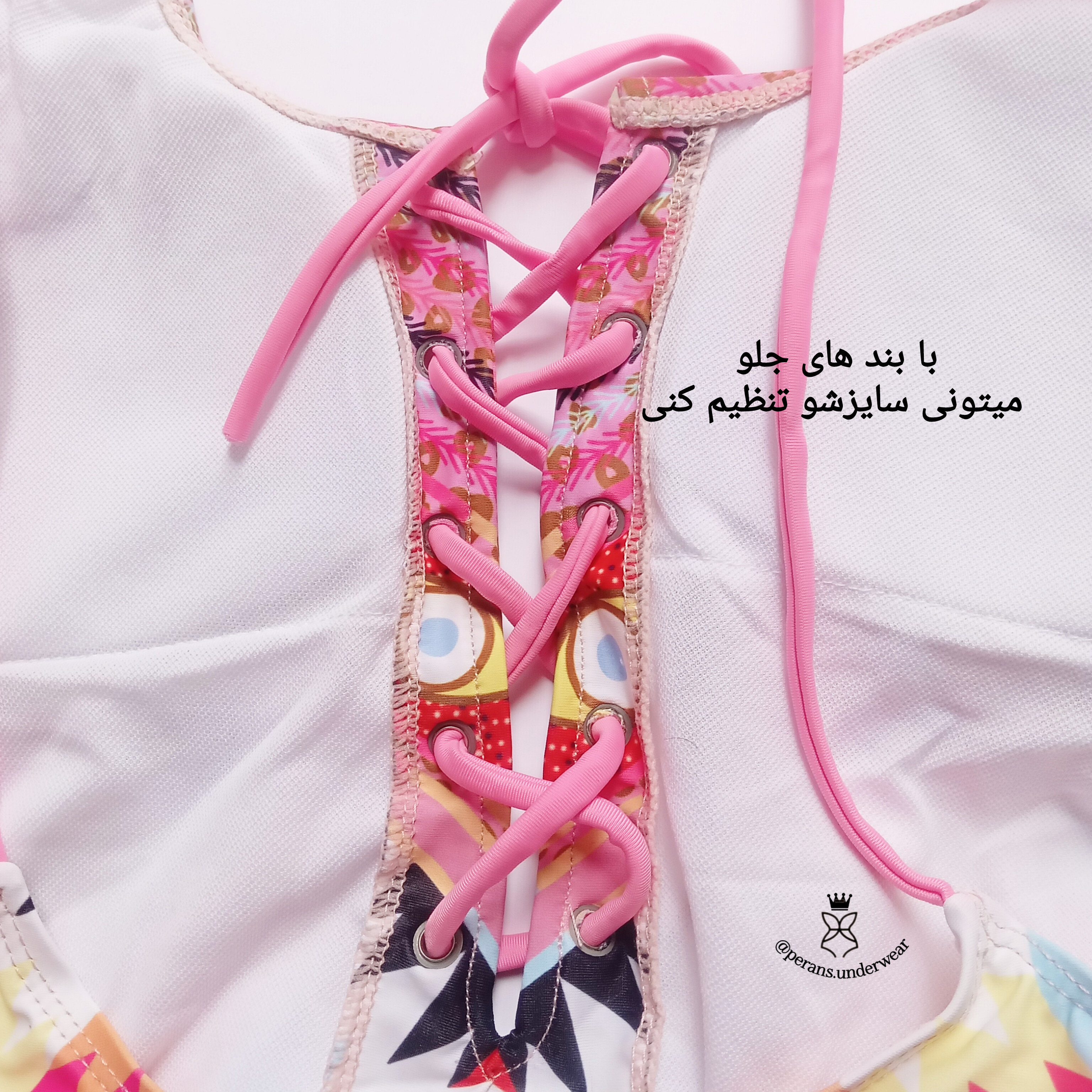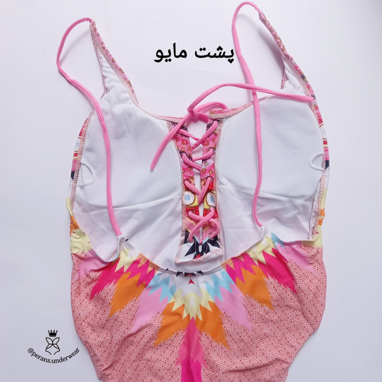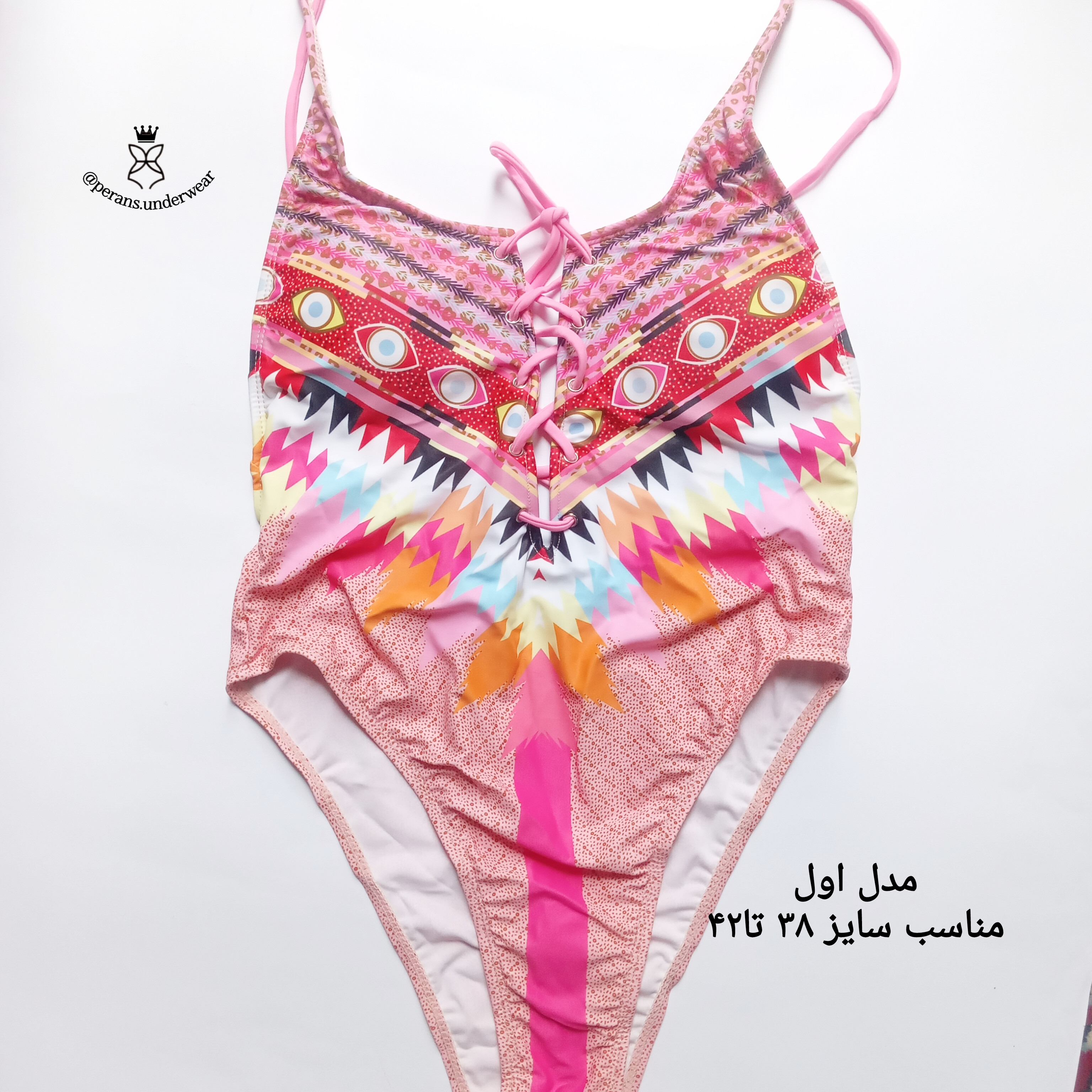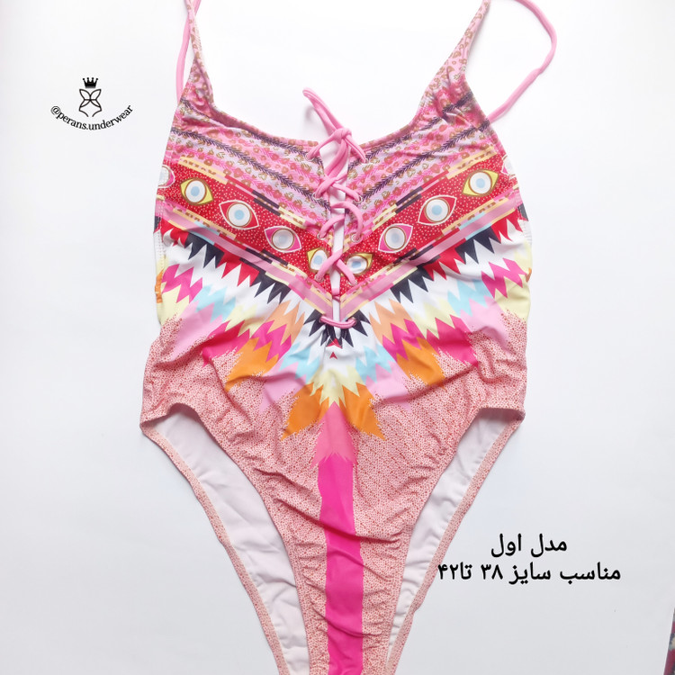 مایو طرحدار رنگی ، مناسب سایز ۳۸ تا۴۲، کاپدار و کاپ متحرک می باشد و سایز با بند های جلو قابل تنظیم است